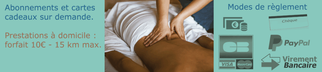 Vous trouverez ci-dessous la liste des massages que je pratique, avec les durées proposées et le tarif correspondant en € TTC. Bien entendu, je vous invite à me contacter pour bien vérifier que le massage choisi vous correspond, ou pour avoir davantage d’informations.